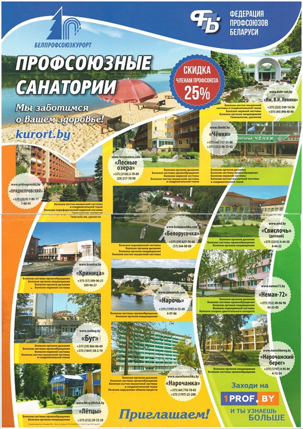 25% | Членам профсоюзов, входящих в состав Федерации профсоюзов | Справка, выдаваемая председателем первичной либо | круглогодично |